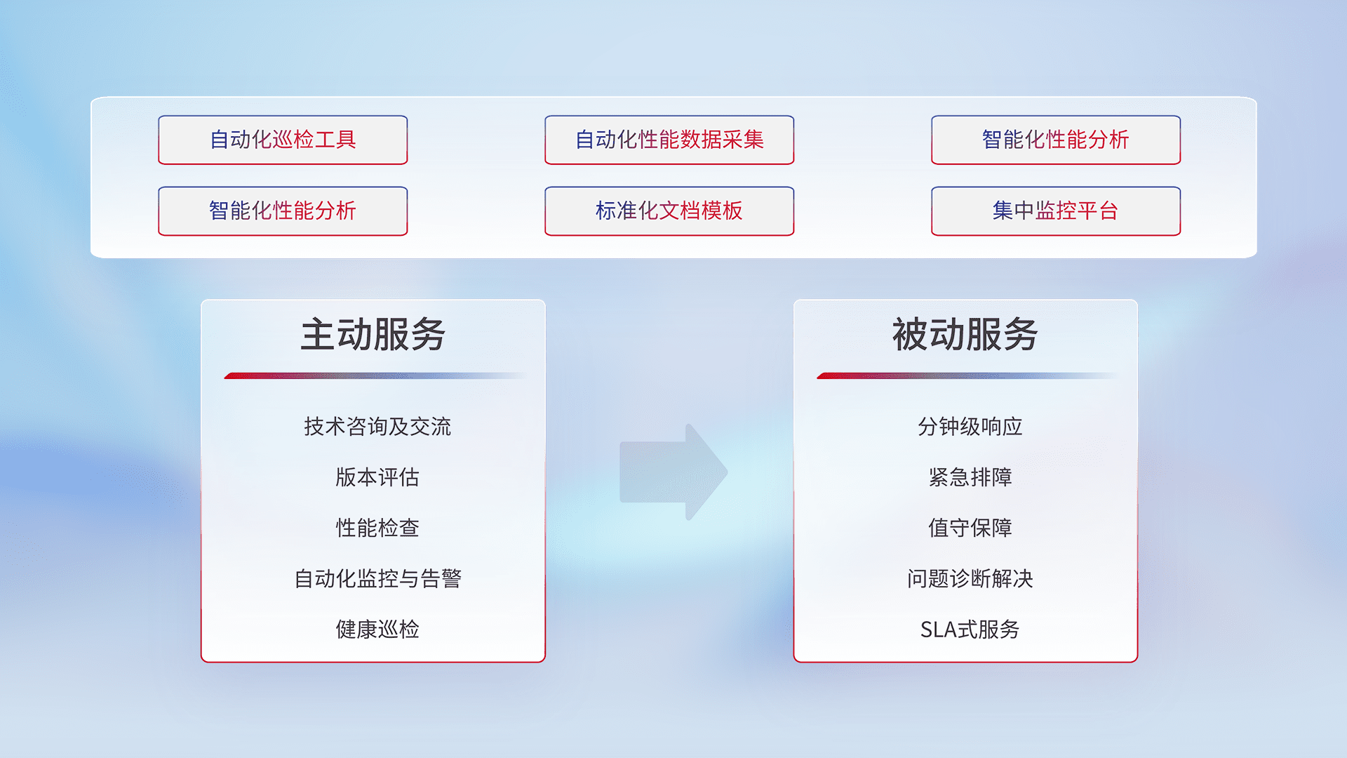智能化工具和标准化文档,,,保障服务质量,,,,提供主动服务(包含技术咨询、、版本评估、、性能检查、、、、自动化监控与告警、、、、健康巡检)和被动服务包含(分钟级响应、、、、紧急排障、、值守保障、、问题诊断解决、、、、SLA服务)。。。